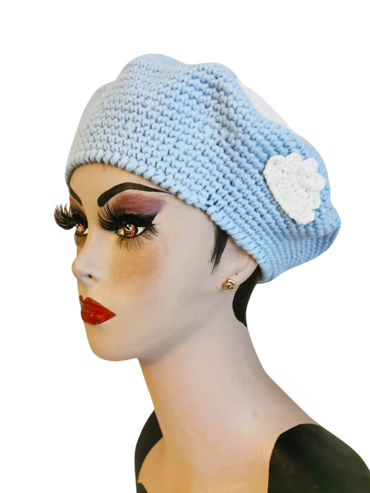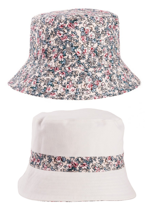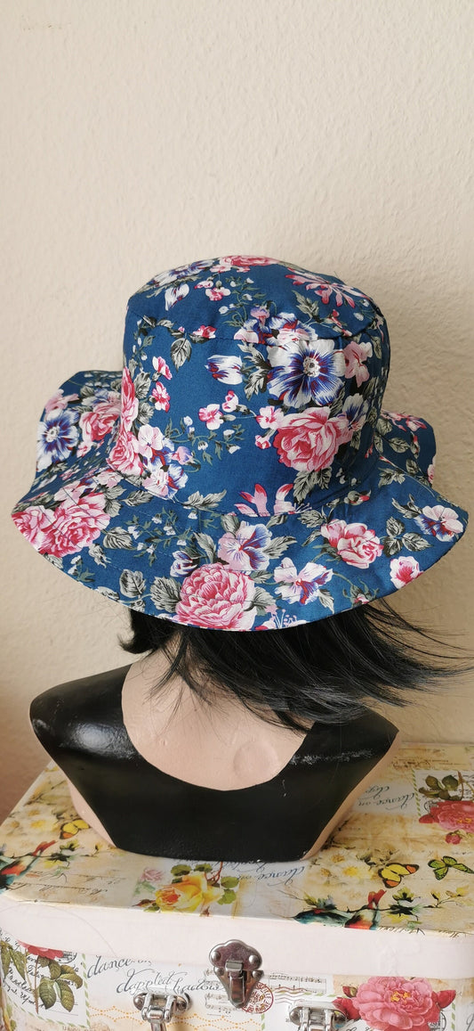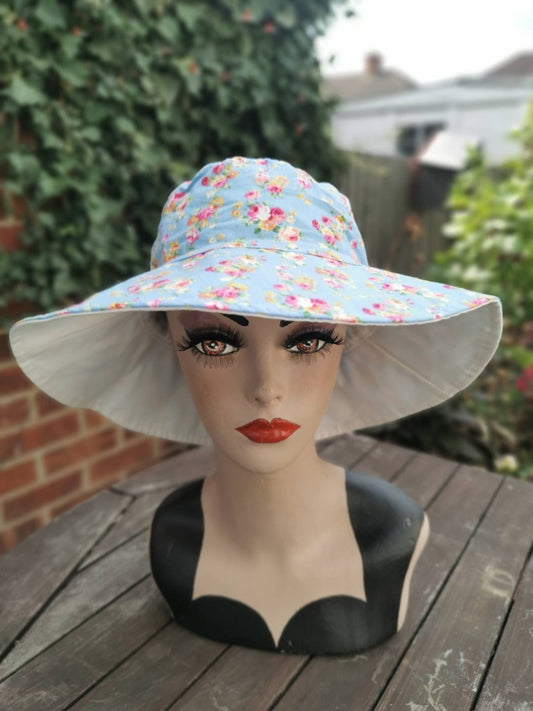 Ladies Summer Hat Wide Brim Flower Floppy Sun Hat Reversible Pink Blue Cotton Handmade
